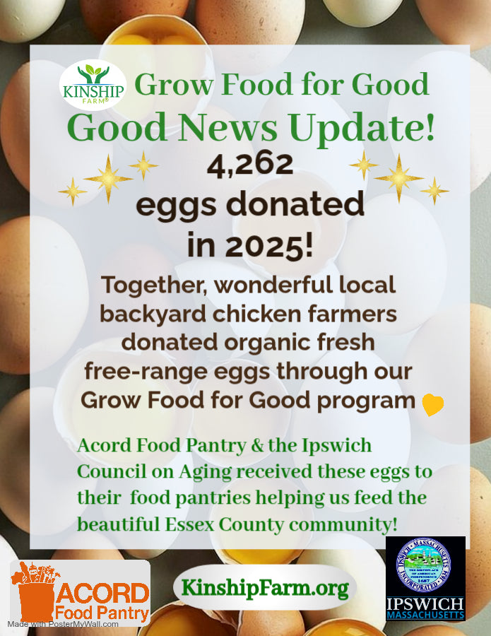 In 2024, Grow Food for Good delivered 2,654 fresh, free-range eggs to families served by the Acord Food Pantry in Hamilton, MA! Follow us on our Facebook and Instagram social media accounts for updates like the one to the right to track our progress during the year.